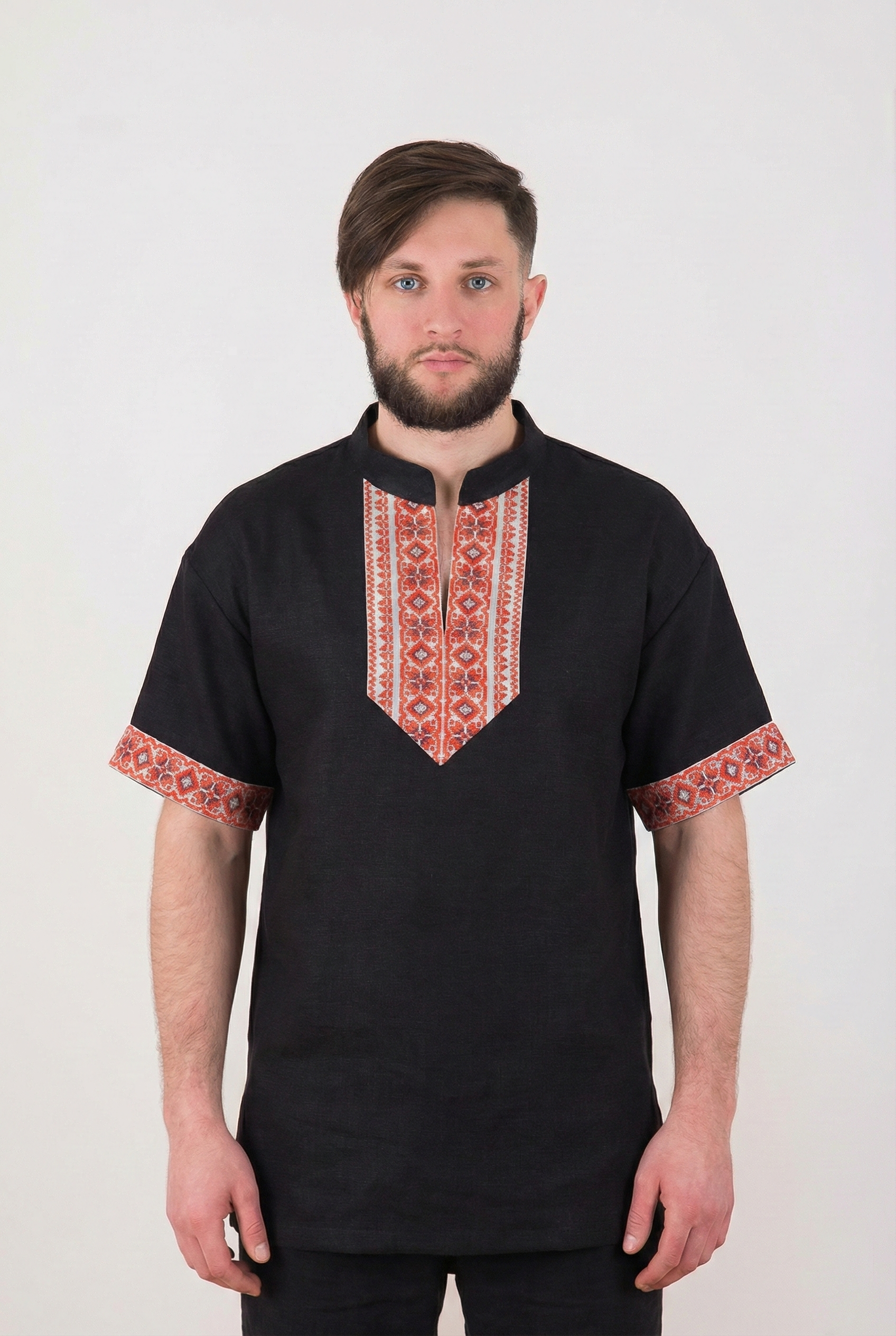 Стилизованная рубаха с коротким рукавом с элементами обережности подчёркивает мужественность сыновей земли русской.