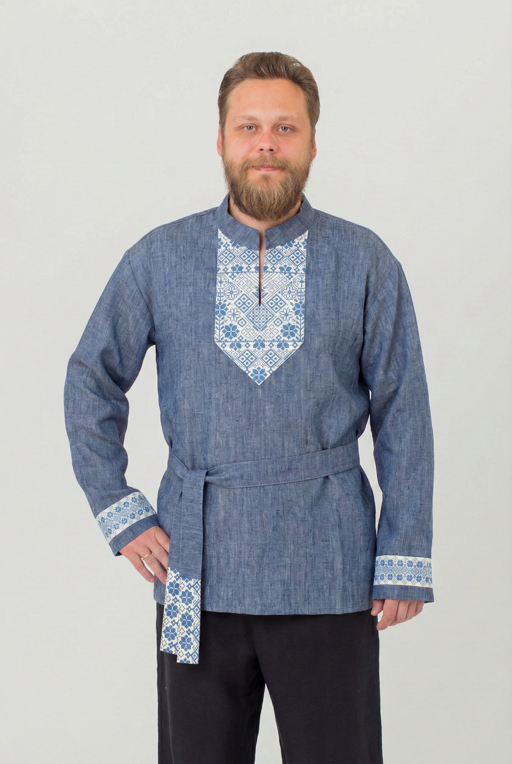 Стилизованная рубаха с длинным рукавом с элементами обережности подчёркивает мужественность сыновей земли русской.