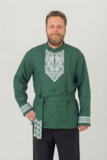 Стилизованная рубаха с длинным рукавом с элементами обережности подчёркивает мужественность сыновей земли русской.