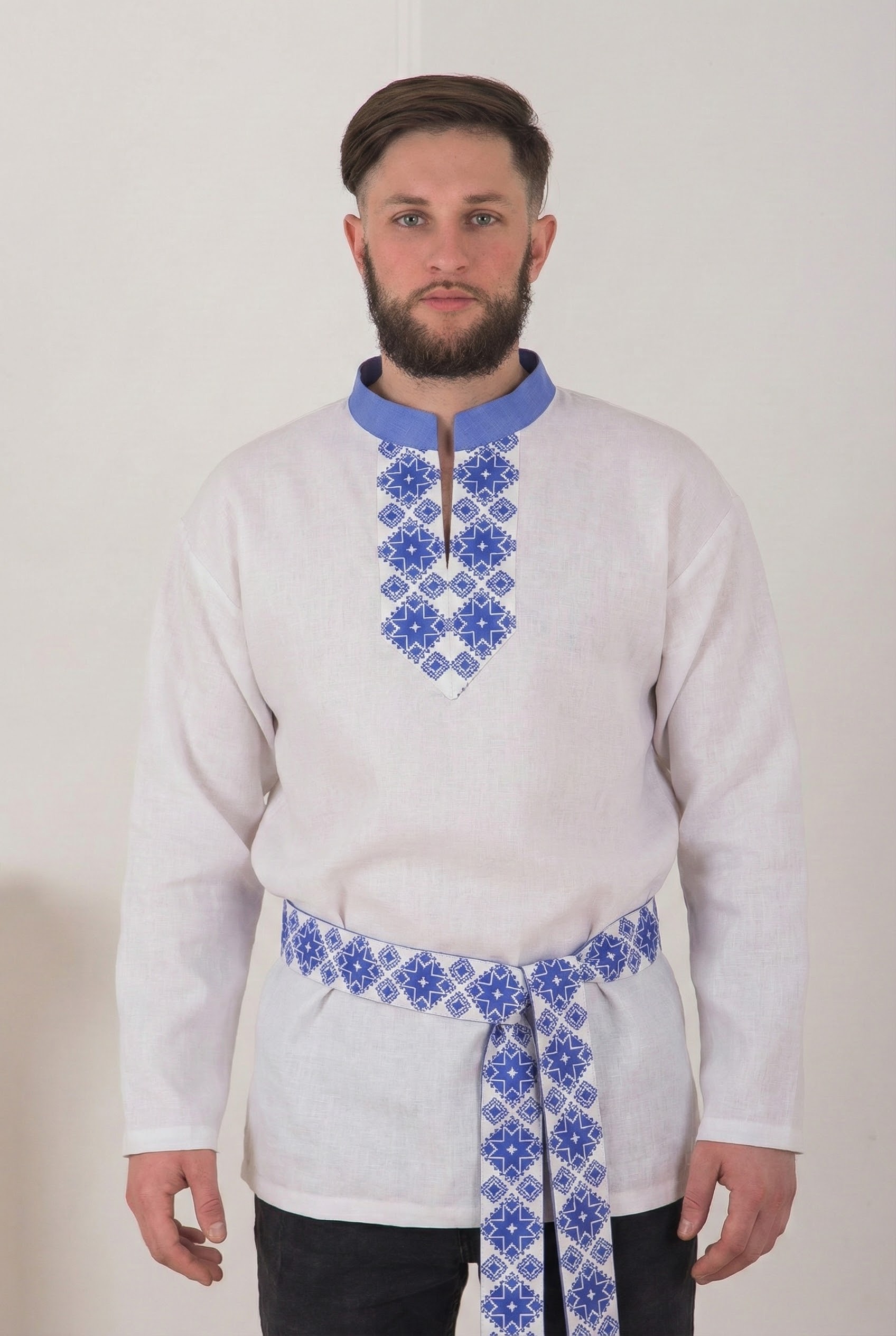 Стилизованная рубаха с длинным рукавом с элементами обережности подчёркивает мужественность сыновей земли русской.