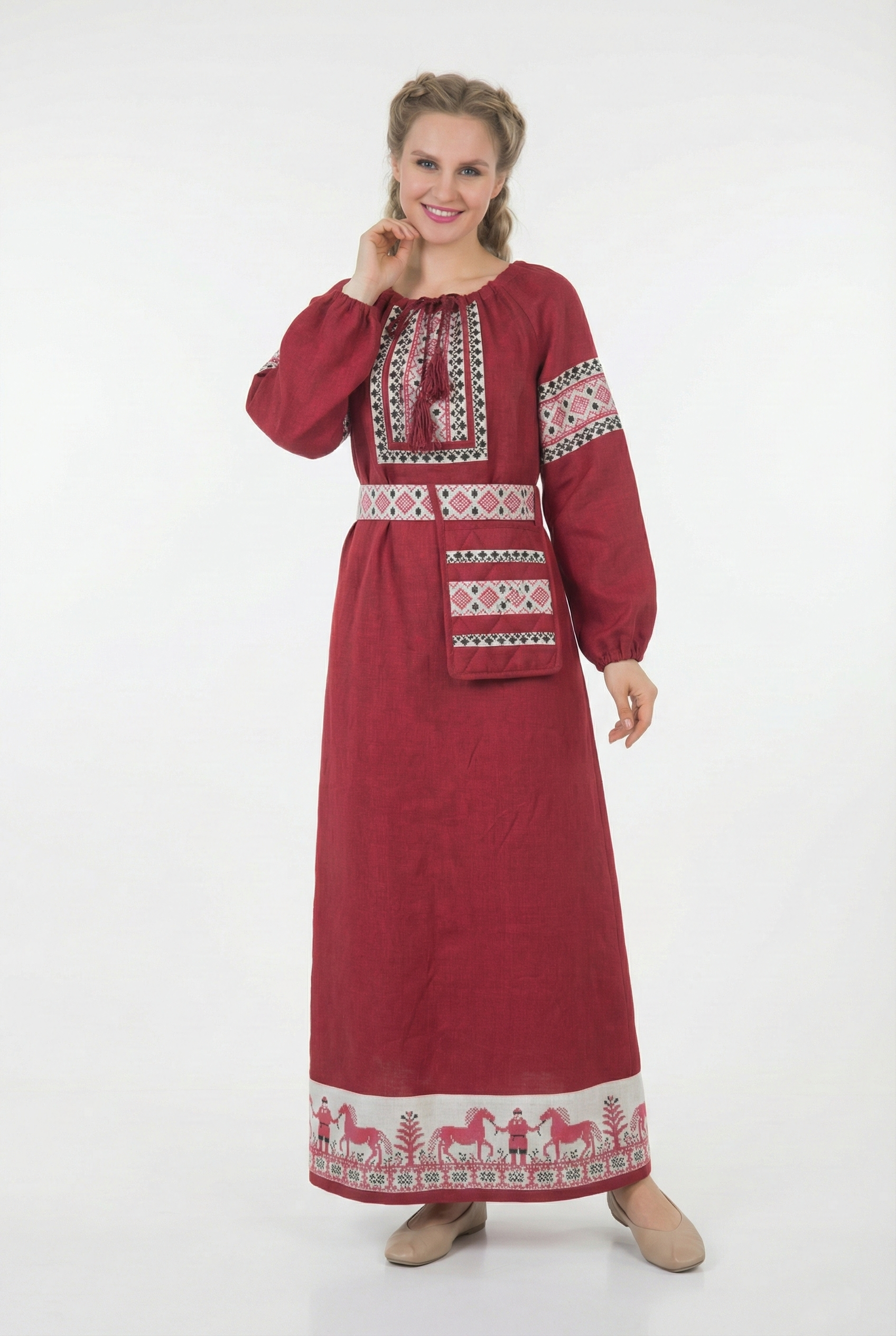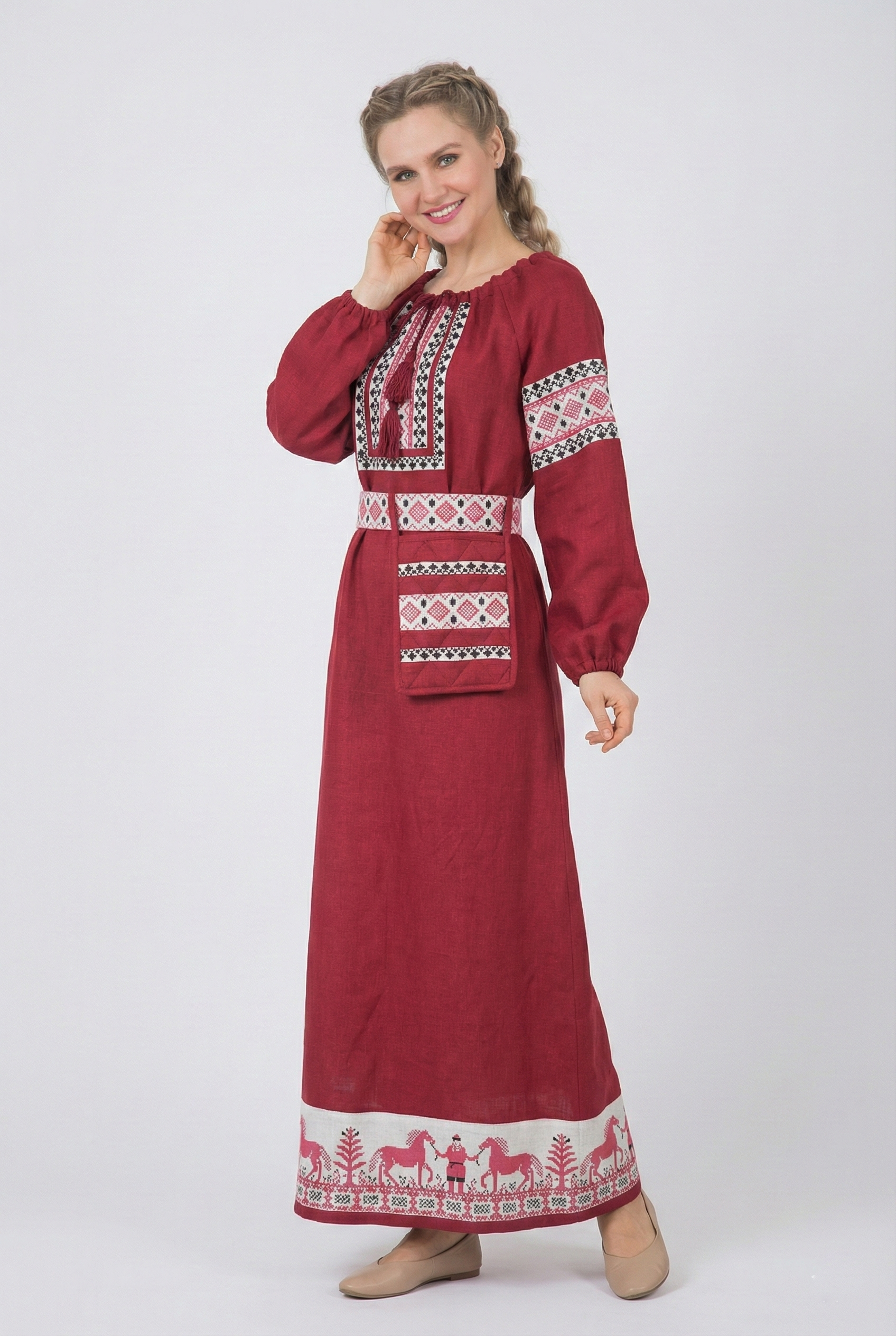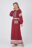 Красивое льняное платье в русском стиле со съёмным поясом из бордового 100% белорусского льна.