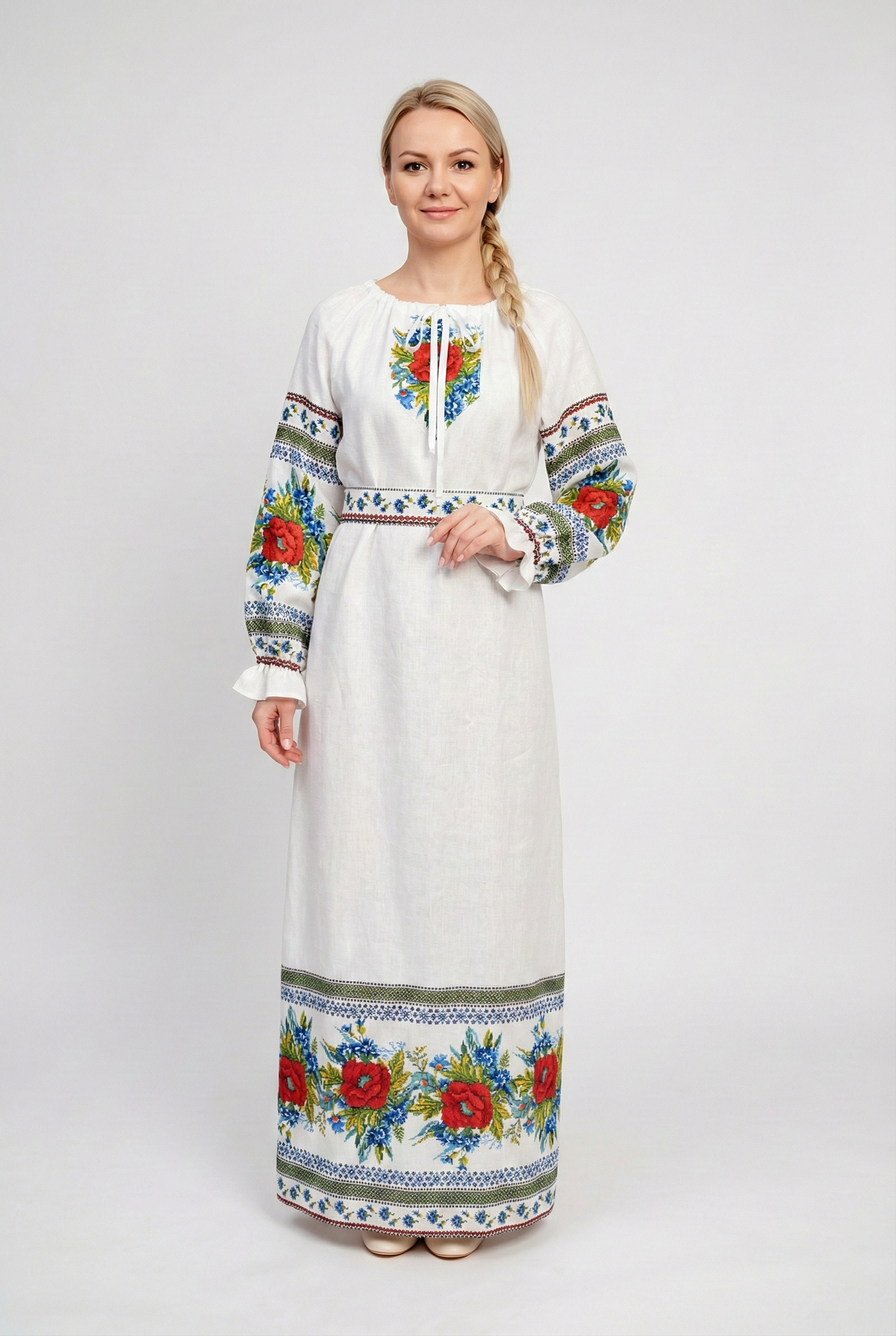 Это длинное льняное платье украшено ярким цветочным принтом с маками в красно-синих тонах, символизирующих любовь, защиту и жизненную энергию. Свободный крой подчёркивает фигуру мягко и естественно, создавая ощущение лёгкости и уюта в каждом движении.