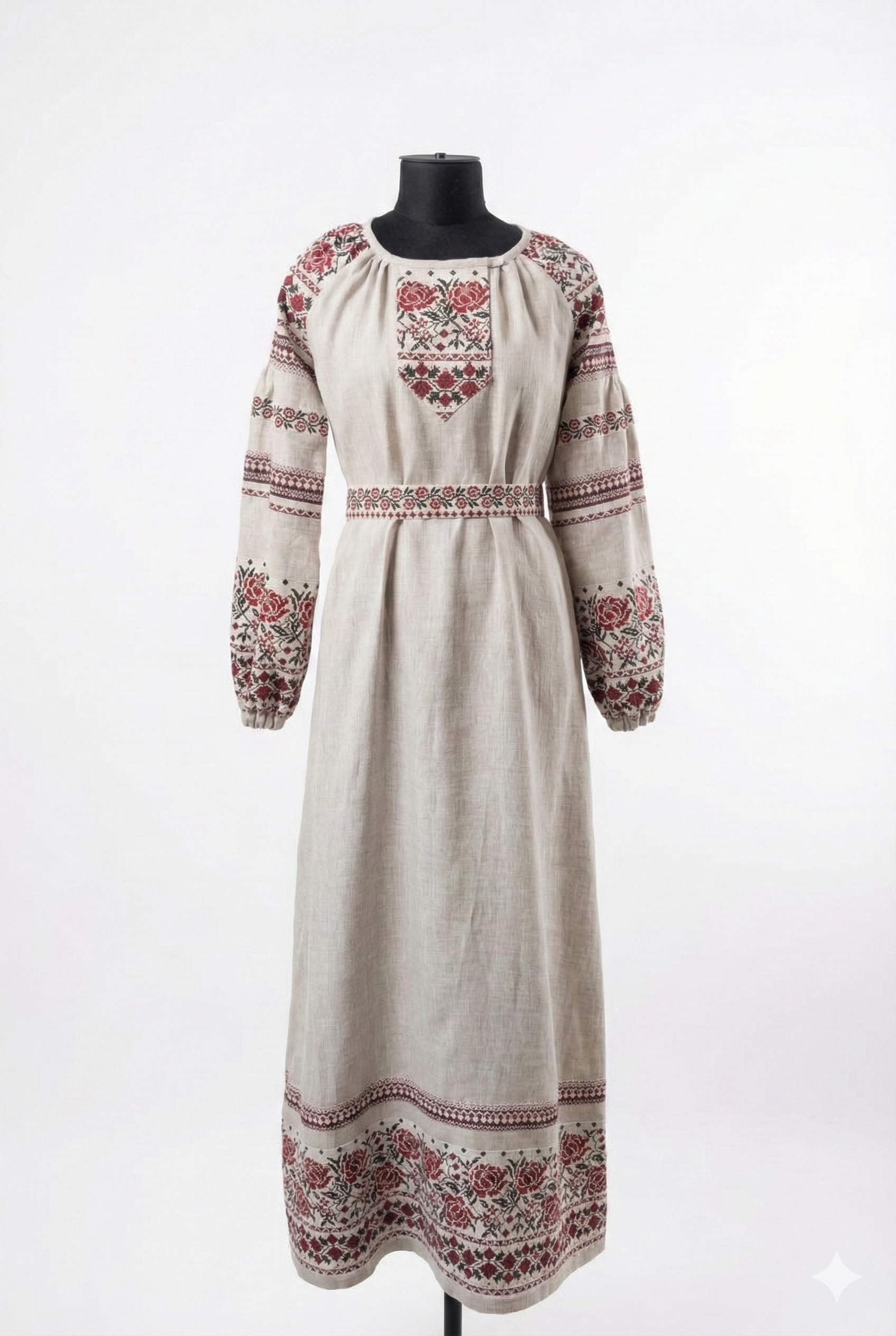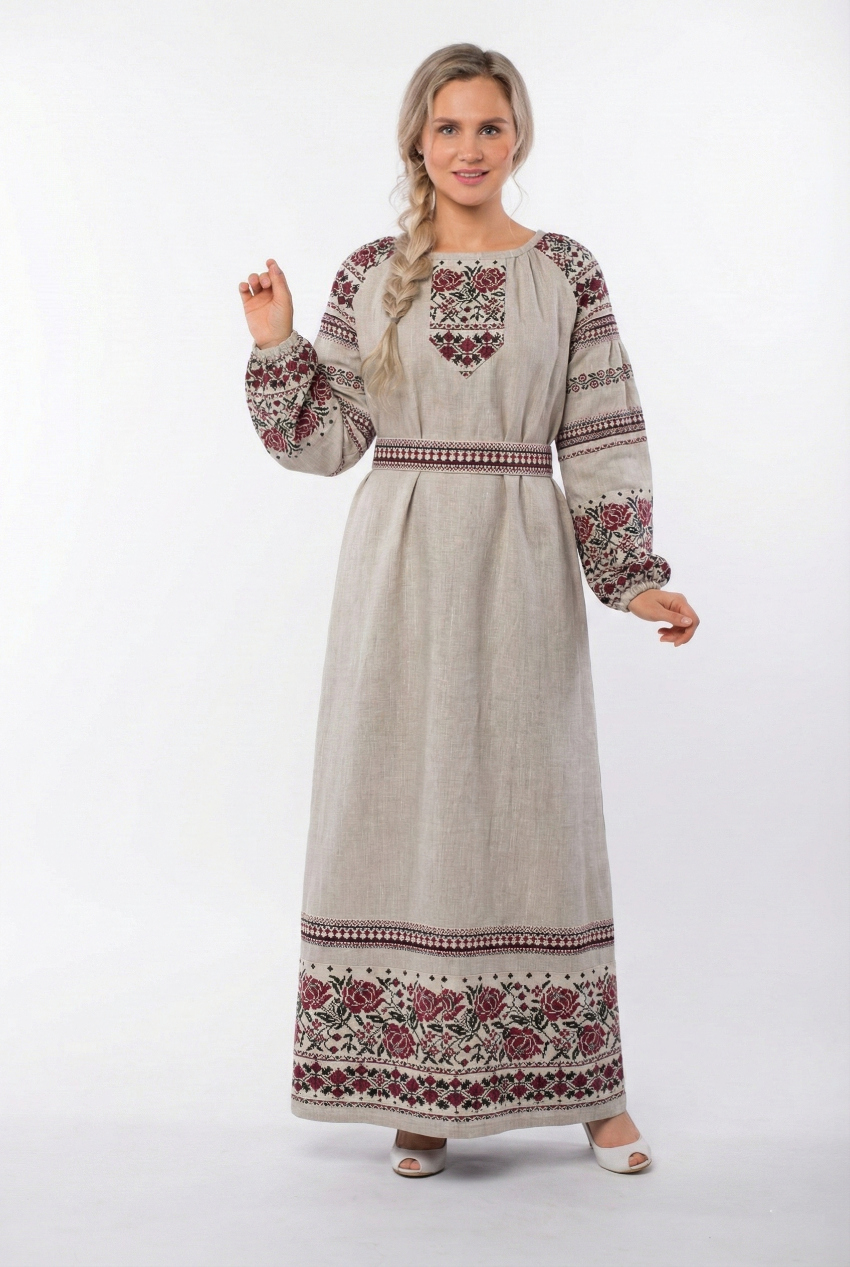 Свободный, слегка трапециевидный крой мягко ниспадает по фигуре, а съёмный пояс позволяет при желании подчеркнуть талию и создать более акцентированный силуэт. Длина макси добавляет образу благородства, а орнаменты на рукавах и подоле придают платью характер и индивидуальность.