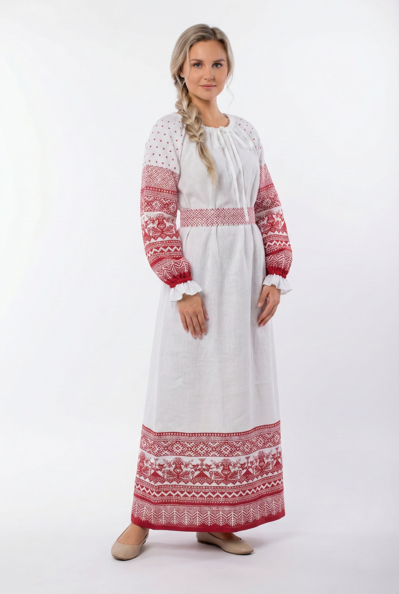 Это платье не просто одежда, а образ. Белый цвет как чистый лист, красный орнамент как живая нить традиции, проходящая через поколения.