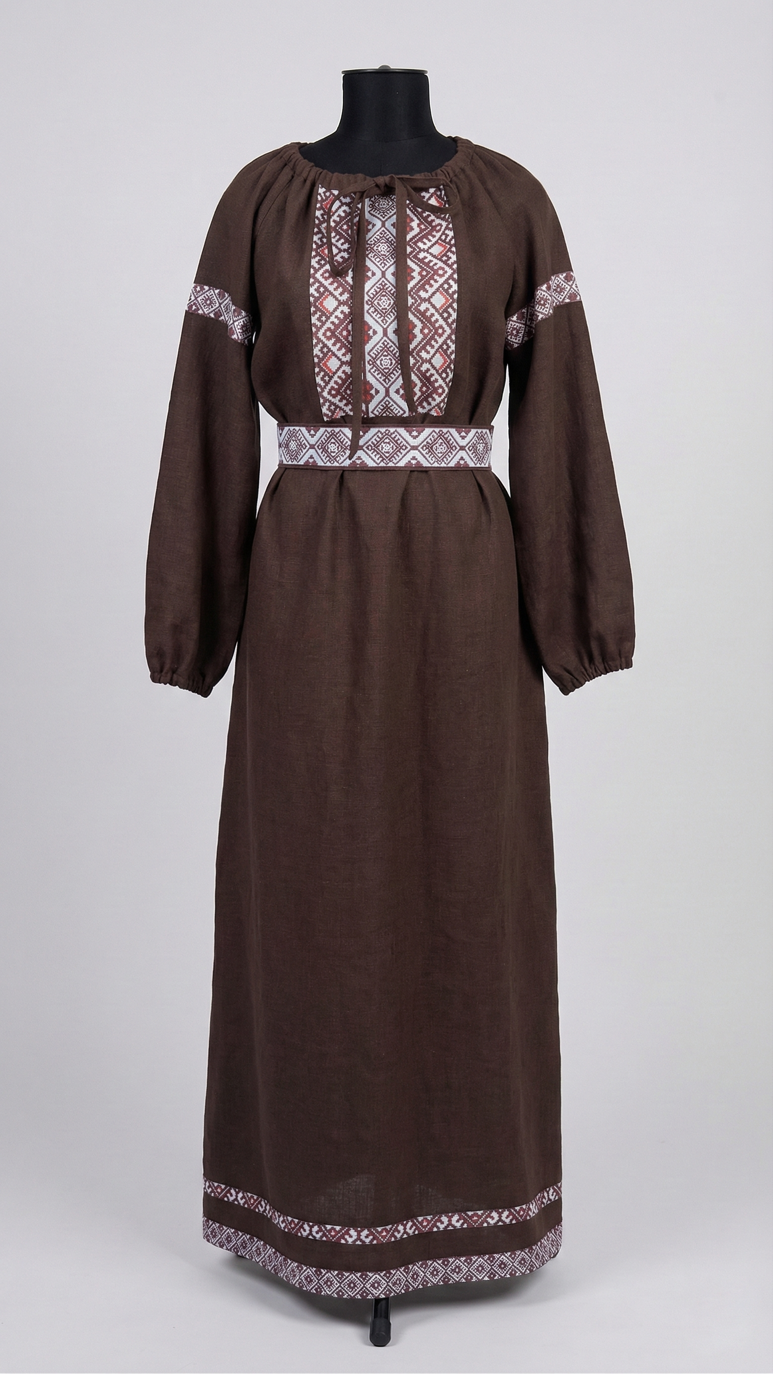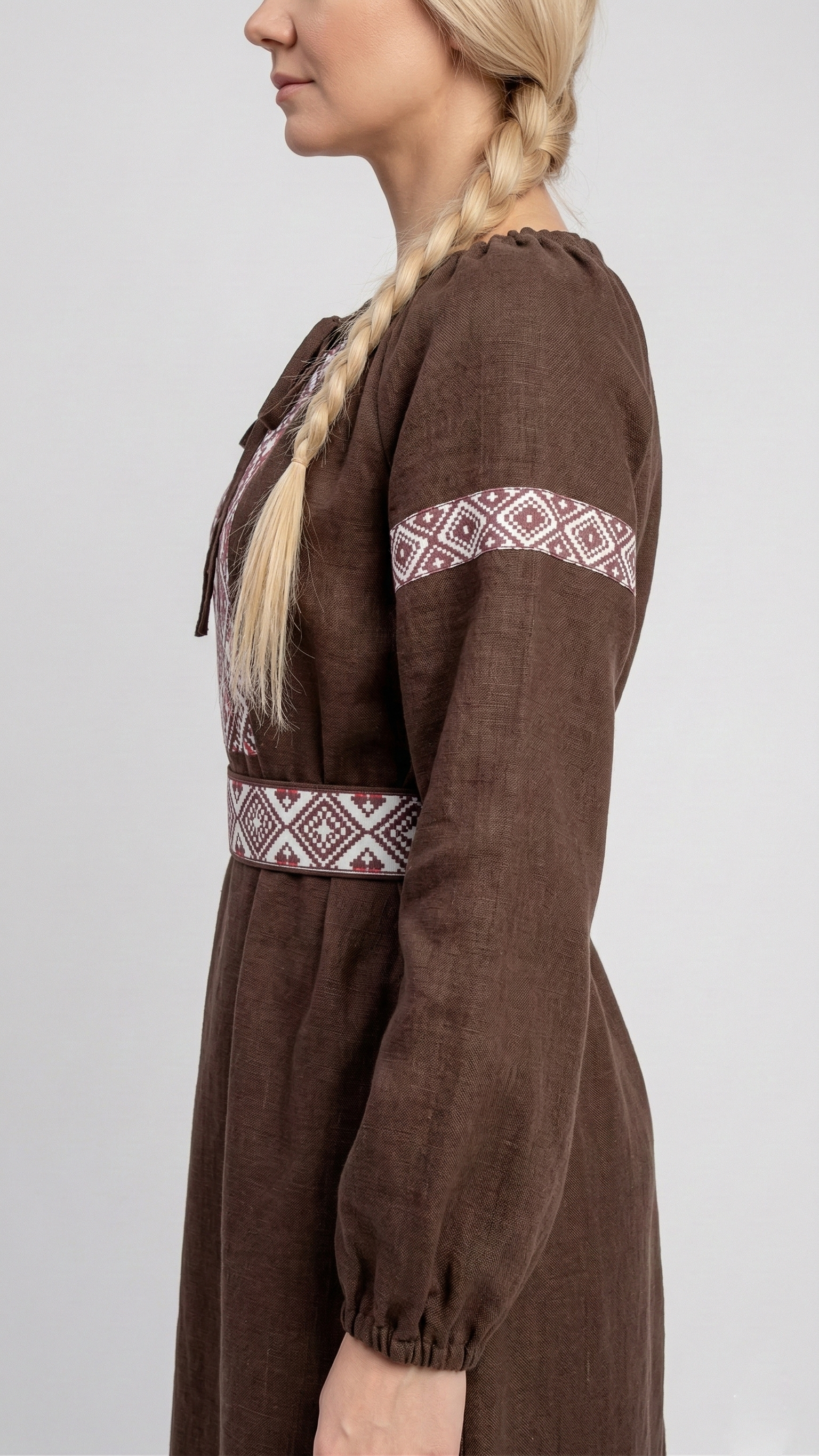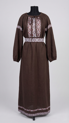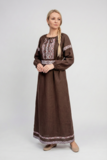 Глубокий оттенок подчёркивает статусность и вкус. Он не кричит, он звучит мягко и уверенно. Этнический орнамент на груди, рукавах и поясе добавляет образу самобытности и создаёт акцент на талии.