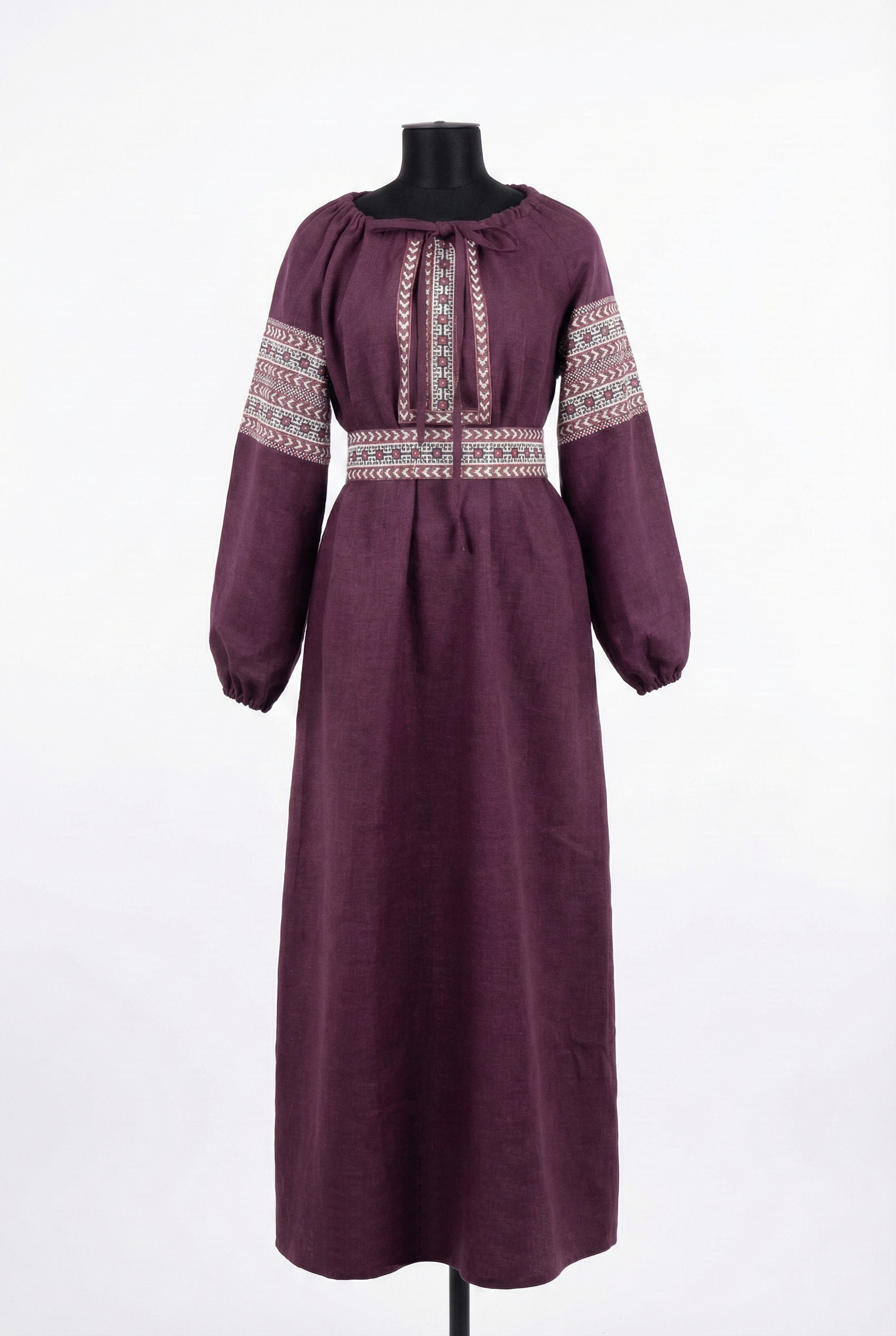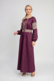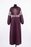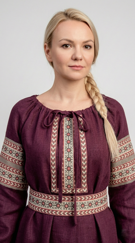 Глубокий оттенок подчёркивает статусность и вкус. Он не кричит, он звучит мягко и уверенно. Этнический орнамент на груди, рукавах и поясе добавляет образу самобытности и создаёт акцент на талии.