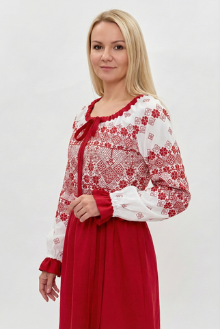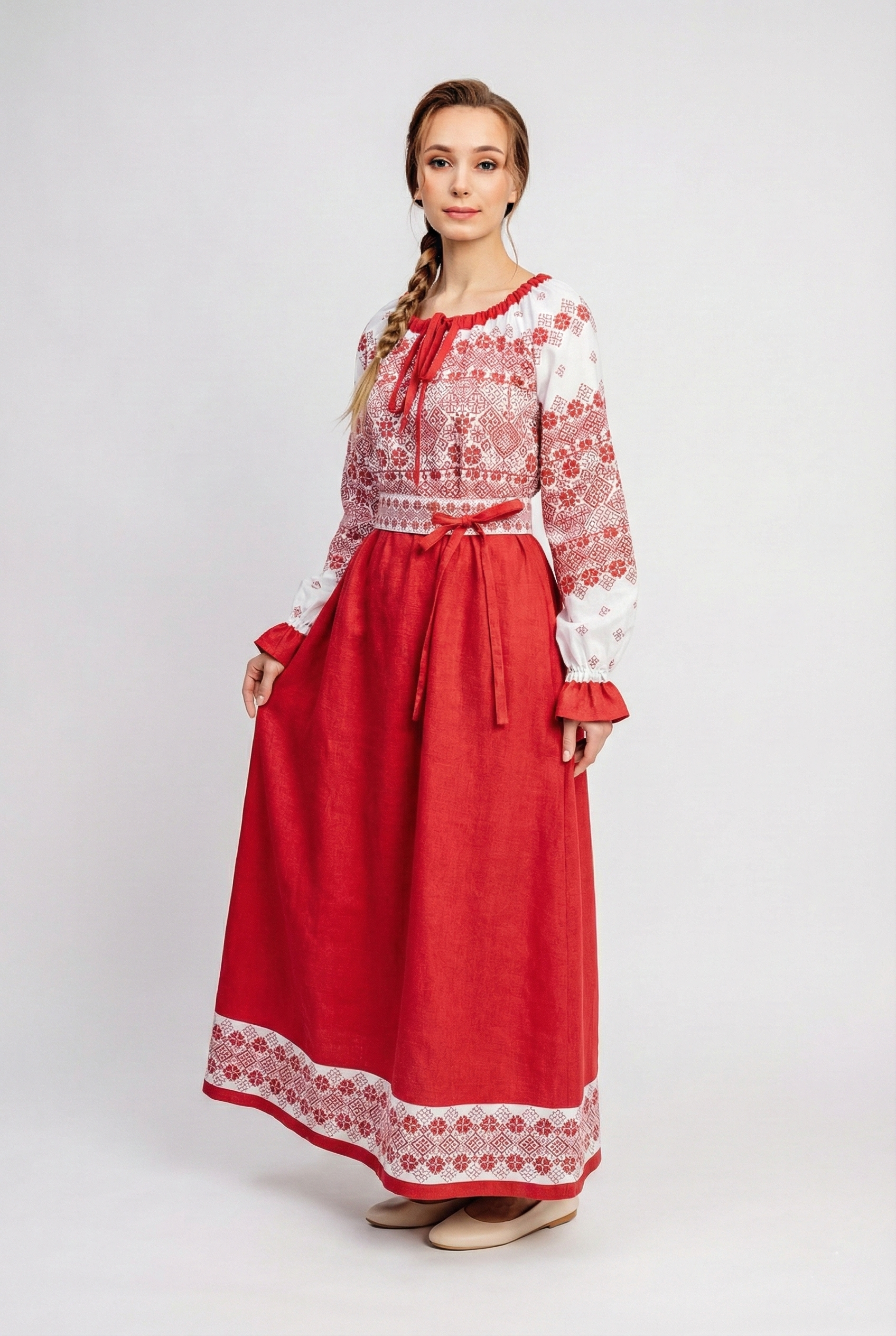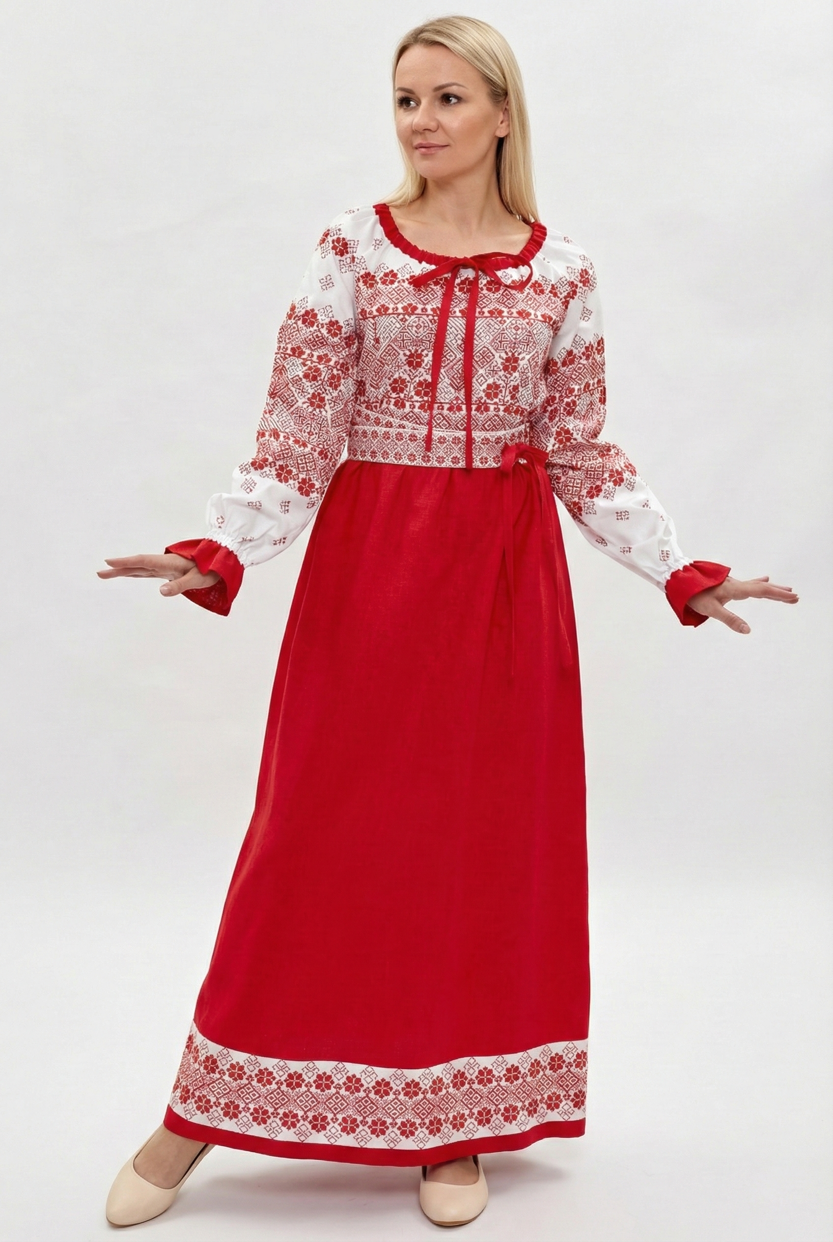 Красивое льняное платье в русском стиле со съёмным поясом из красного льна и неповторимым орнаментом на белом фоне.