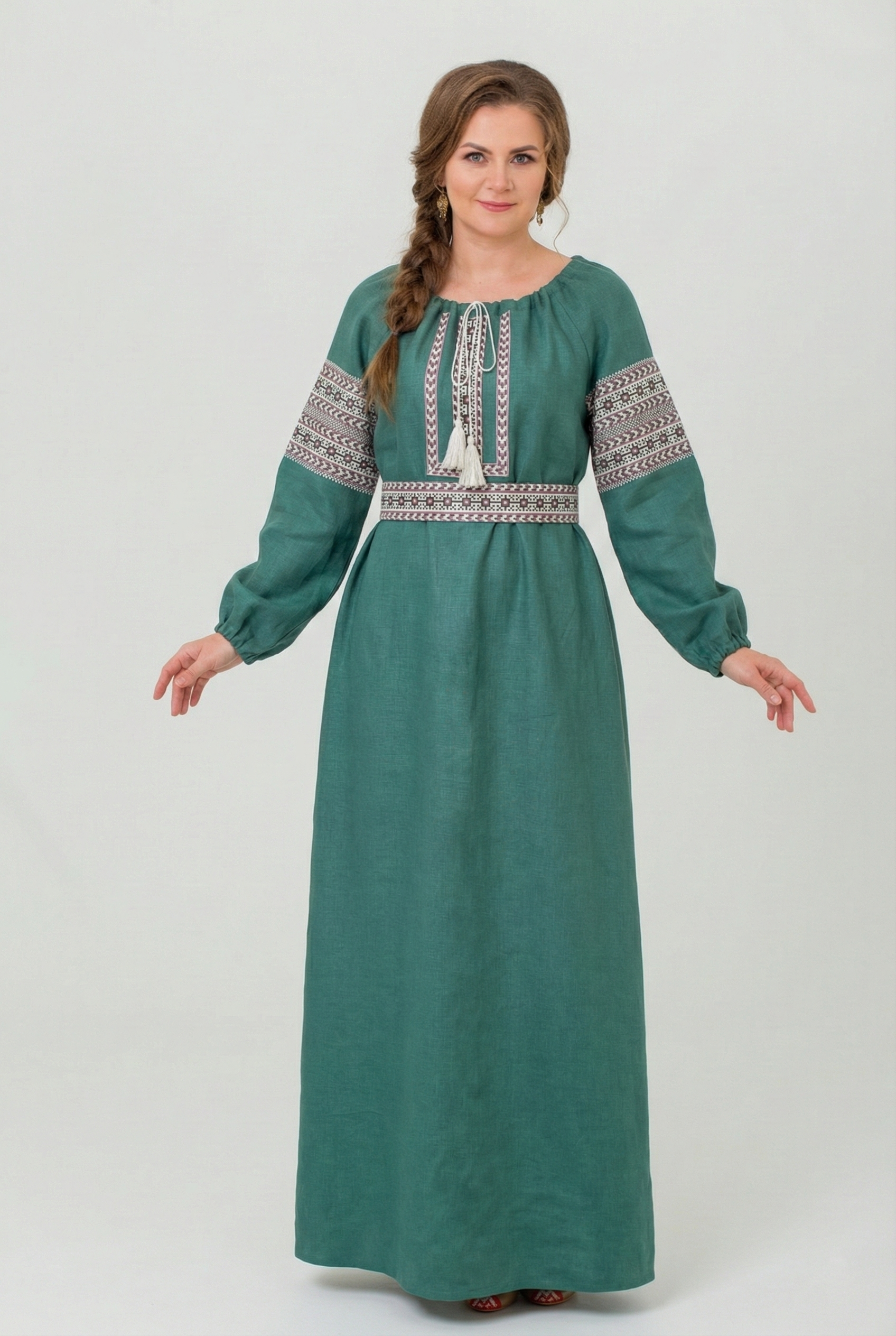 Яркое платье в цвете "тёмная хвоя". Платье в русском стиле свободного кроя, приталивается поясом (в комплекте) и регулируется по горловине шнурком. Подберём очелье в тон, кармашек-лакомник в комплект, рубашку для семейного образа.