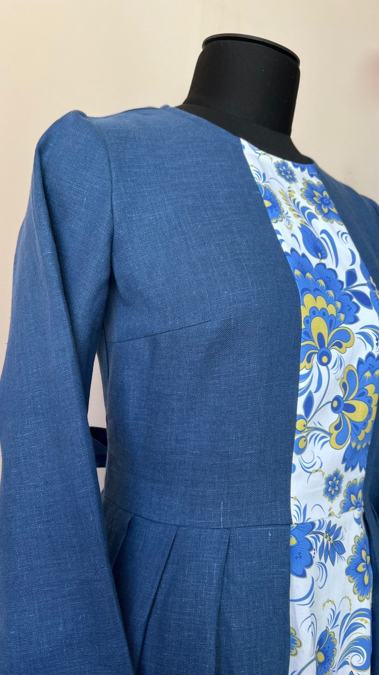 Это платье выполнено в русском стиле и украшено дизайнерской вариацией стиля гжель. Темно синие тона платья отлично сочетаются с ярким узором.