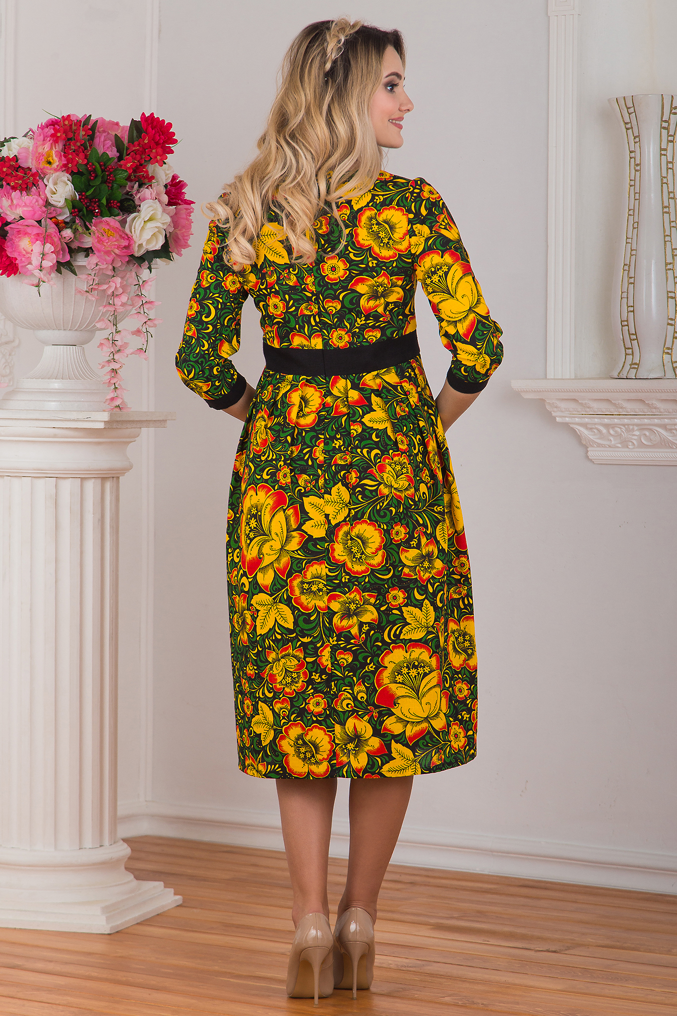 Необычный втачной пояс добавляет красоты этому платью, как и узор "Хохлома".