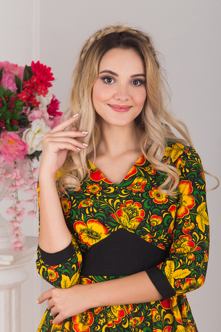 Красивое, яркое и необычное платье с орнаментом Хохлома. Длина платья и рукава позволяет носить его в любое время года.
