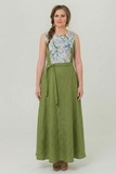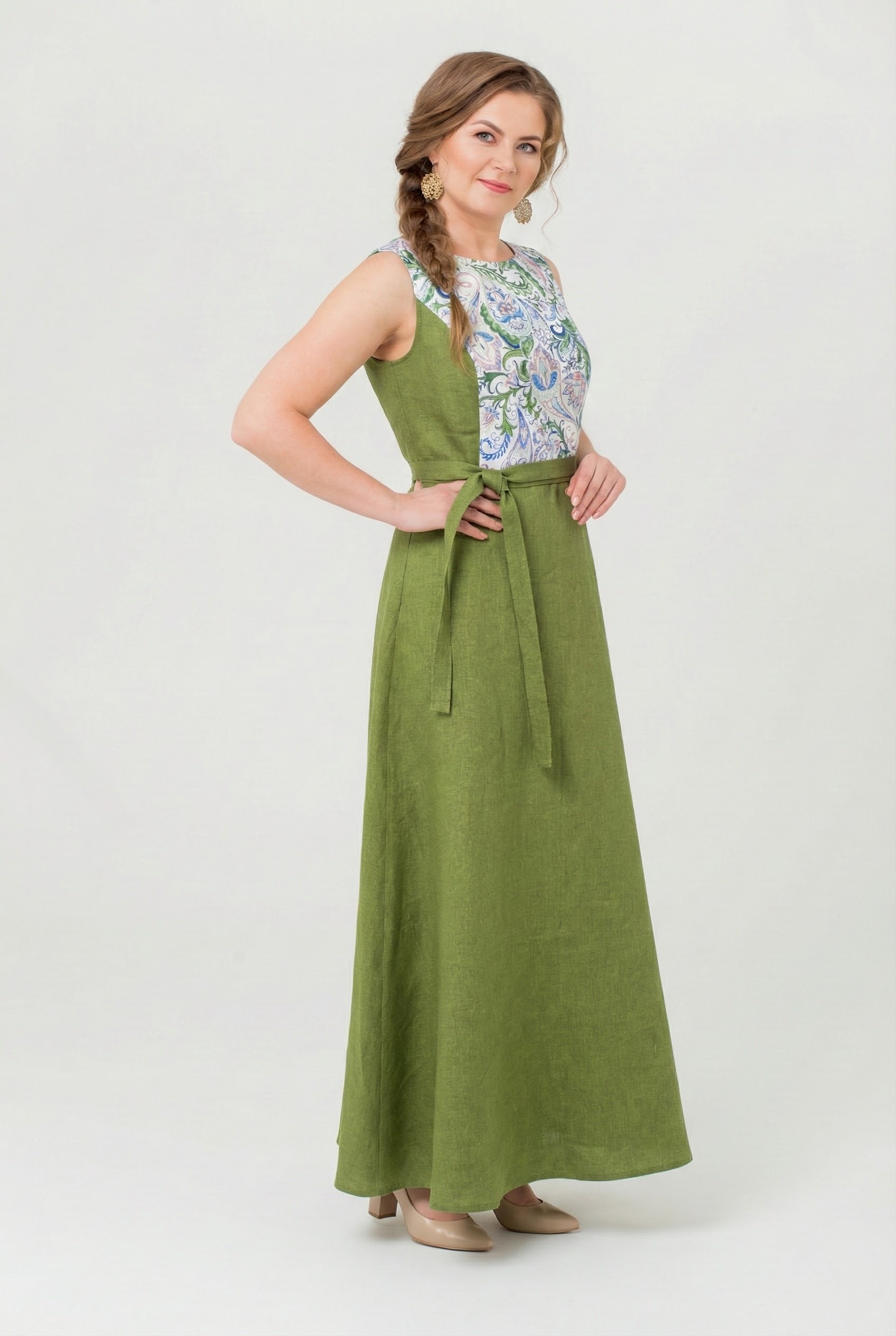 Современная интерпретация русского стиля, созданная для тех, кто ценит природную гармонию и уникальные детали. Верх платья украшен изысканным орнаментом с нежными завитками трав, листьев и цветочных мотивов, будто дыхание леса, перенесённое на ткань. Зелёный лён струится вниз лёгкой волной, создавая утончённый силуэт и даря невероятный комфорт в движении.