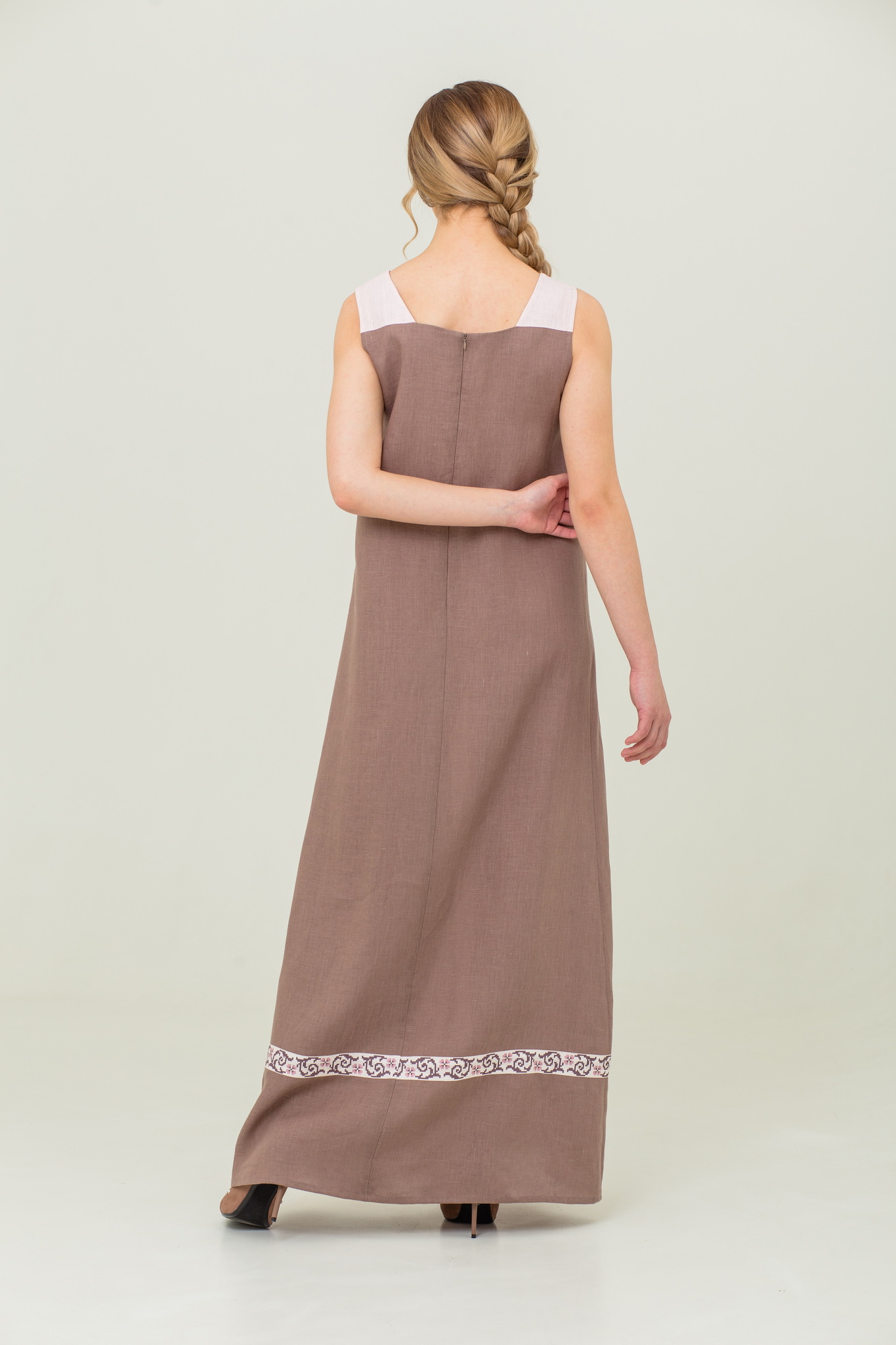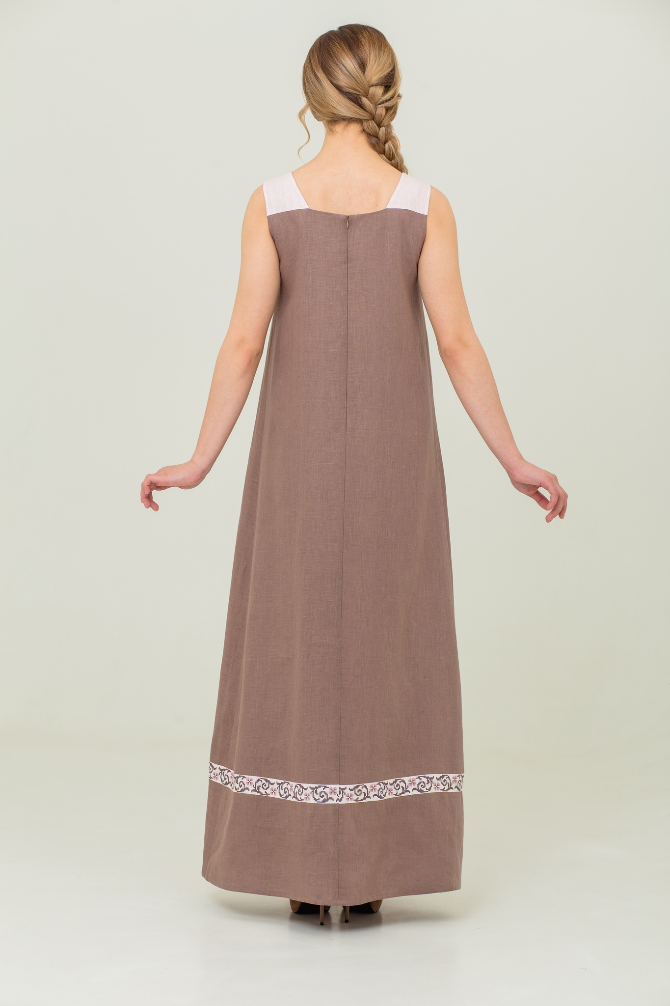 | Спинка | Спинка из ткани основы, со средним швом, молния в среднем шве. По низу полоса орнамента. |